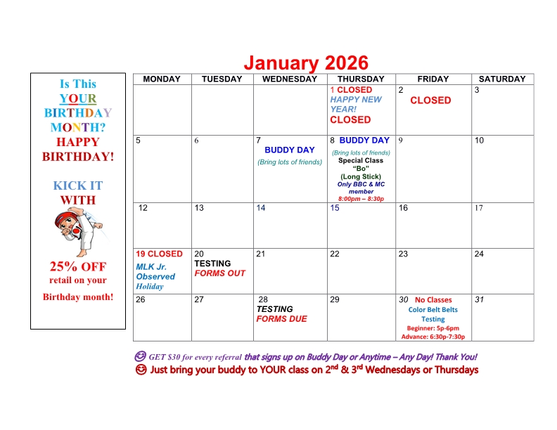 Color Belt tests normally falls on the 3rd or 4th Friday of each month.